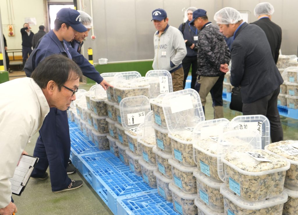 仕上がりを確かめた複数の買受人は「浜ごとにばらつきはある」と前置きした上で「小型メインだった昨年の初入札よりは粒サイズが全体的に上向いた。卵の抜けは遅れがある」といい、「今後のさらなる水温低下に期待したい」と話す。夏場の高水温によるへい死は昨年より少なく、上場量増につながった。