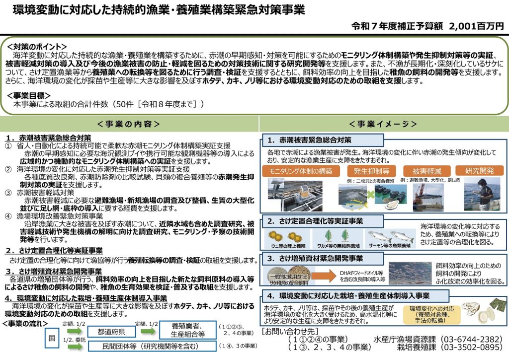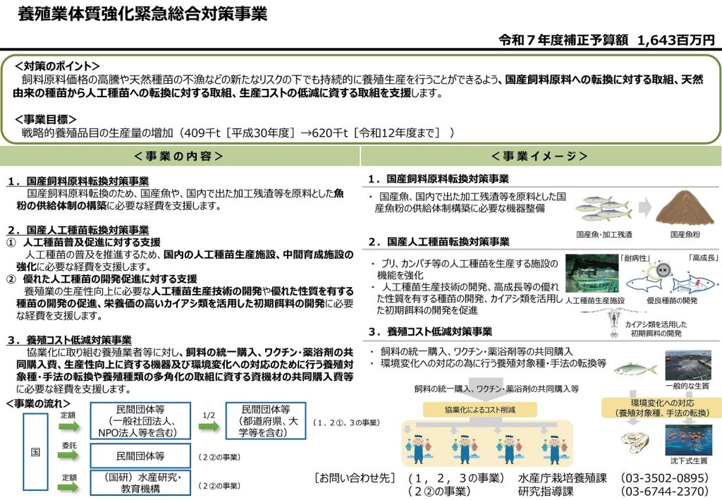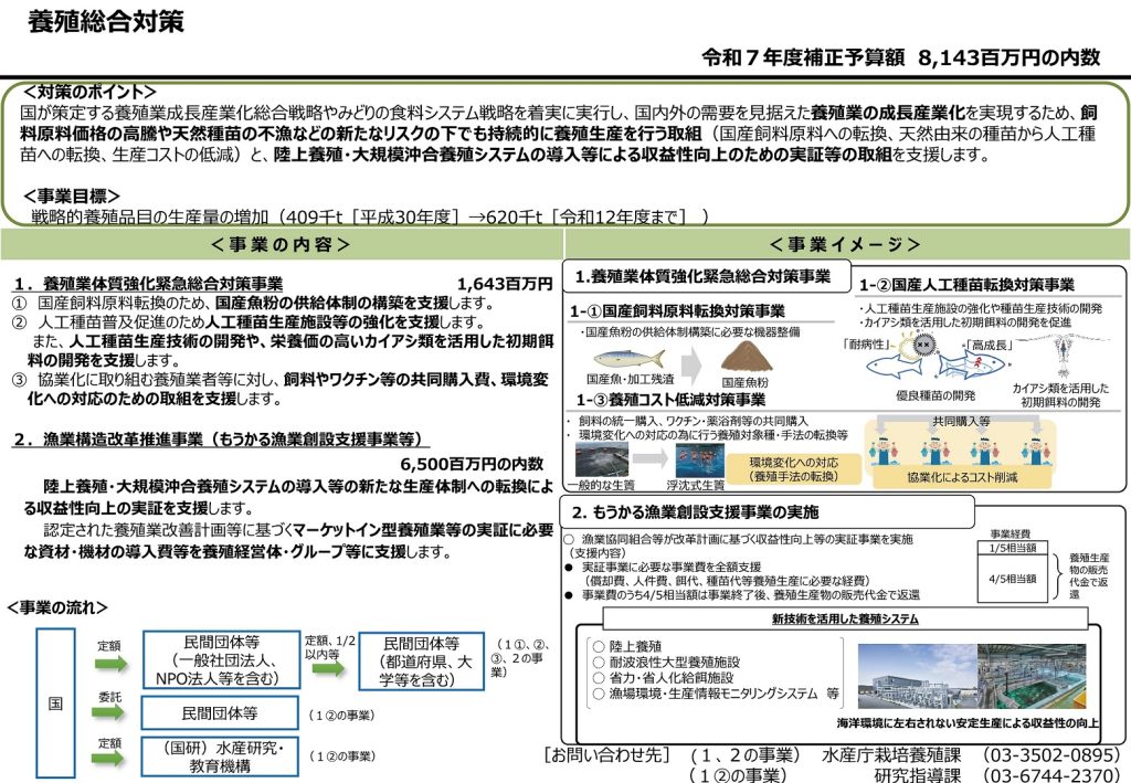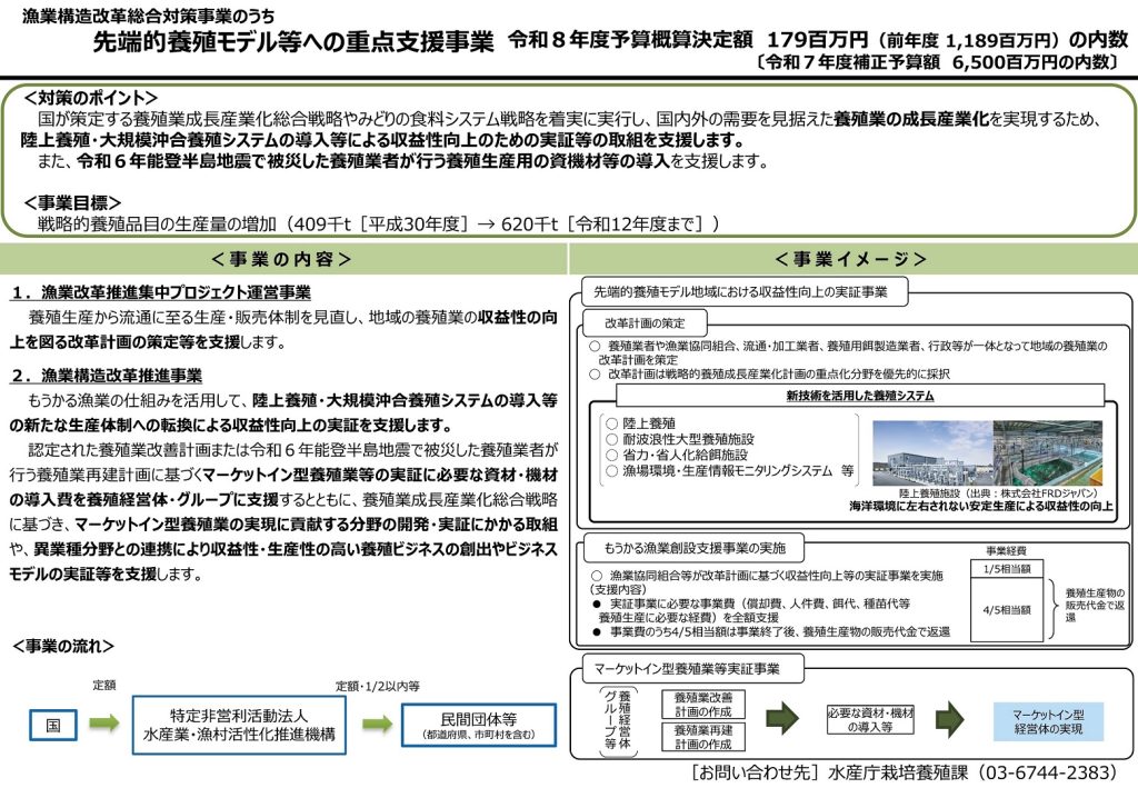政府の2026年度予算案は、水産関係が1876億円に上った。25年度補正と合算した額は3274億円と過去最高となり、8年連続の3000億円を超える大型編成となった。養殖業については、両予算で政府の推進する成長産業化に向けた事業者への支援を手厚くする。養殖業者に向けては、陸上養殖や大規模沖合養殖システムの導入に対する補助を実施。生産体制についても、魚粉や人工種苗の国産転換による海外依存の低減を目指す。この他、近年発生している赤潮による被害を軽減するための緊急対策を計上。広域的、機動的なモニタリング体制の構築の実証を行う他、赤潮が発生した際に避難する漁場や新たな漁場の開発、いけすの大型化などに対する経費を補助する。高市政権は1月下旬の通常国会冒頭で衆院を解散しており、26年度の予算審議は大幅にずれ込む。年度内成立は困難な見通しで、つなぎの暫定予算などで対応する可能性が高い。